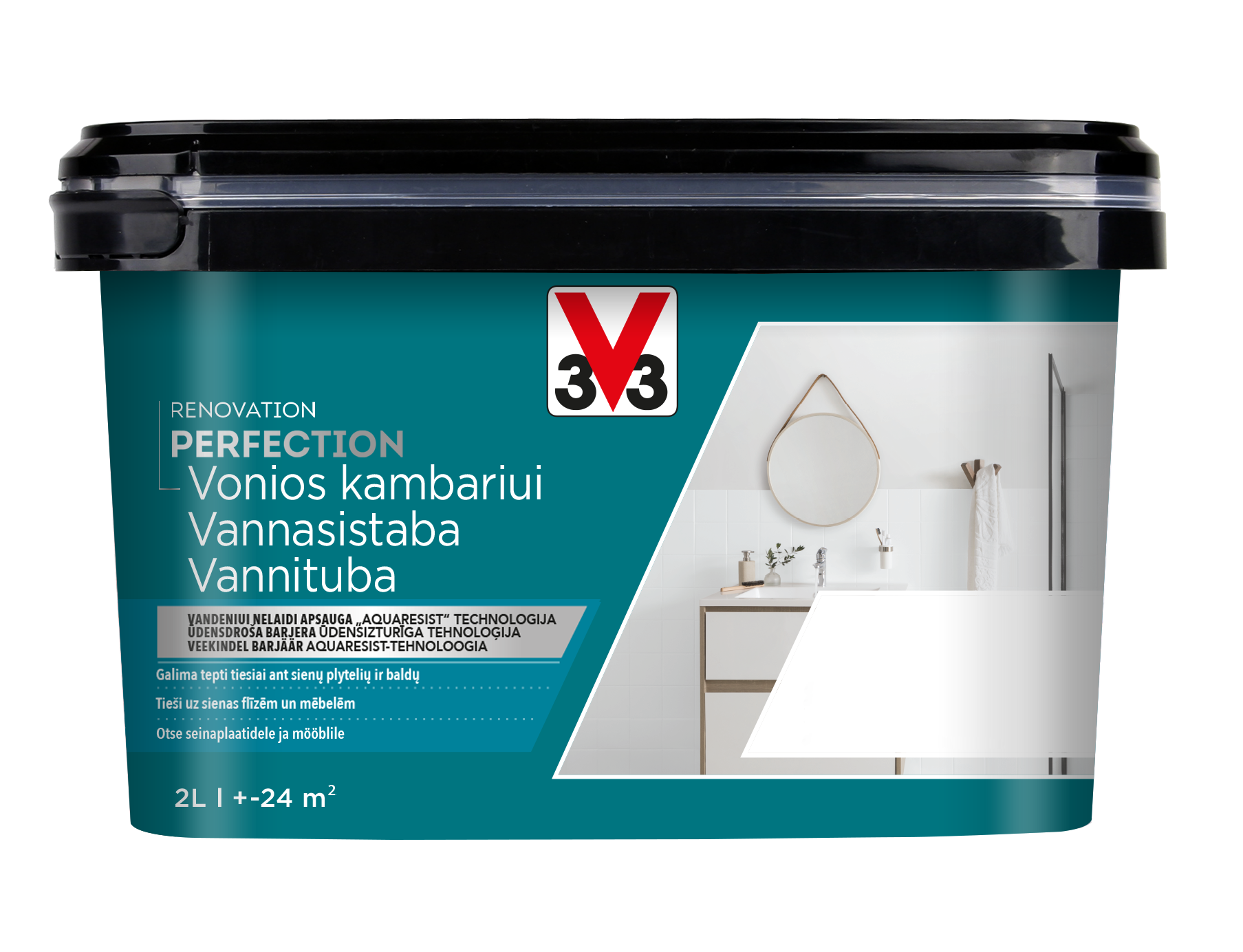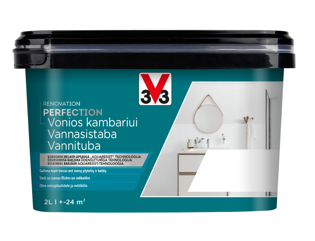 Renovācijas krāsa “Renovation Perfection Vannasistaba” ir lieliski piemērota vannasistabas sienu flīžu atjaunošanai, arī dušas iekšpusē, kā arī vannasistabas mēbeļu atjaunošanai.• Necaurlaidīgs, ūdensizturīgs pārklājums, pateicoties Aquaresist tehnoloģijai.
